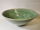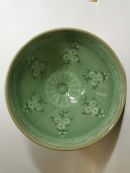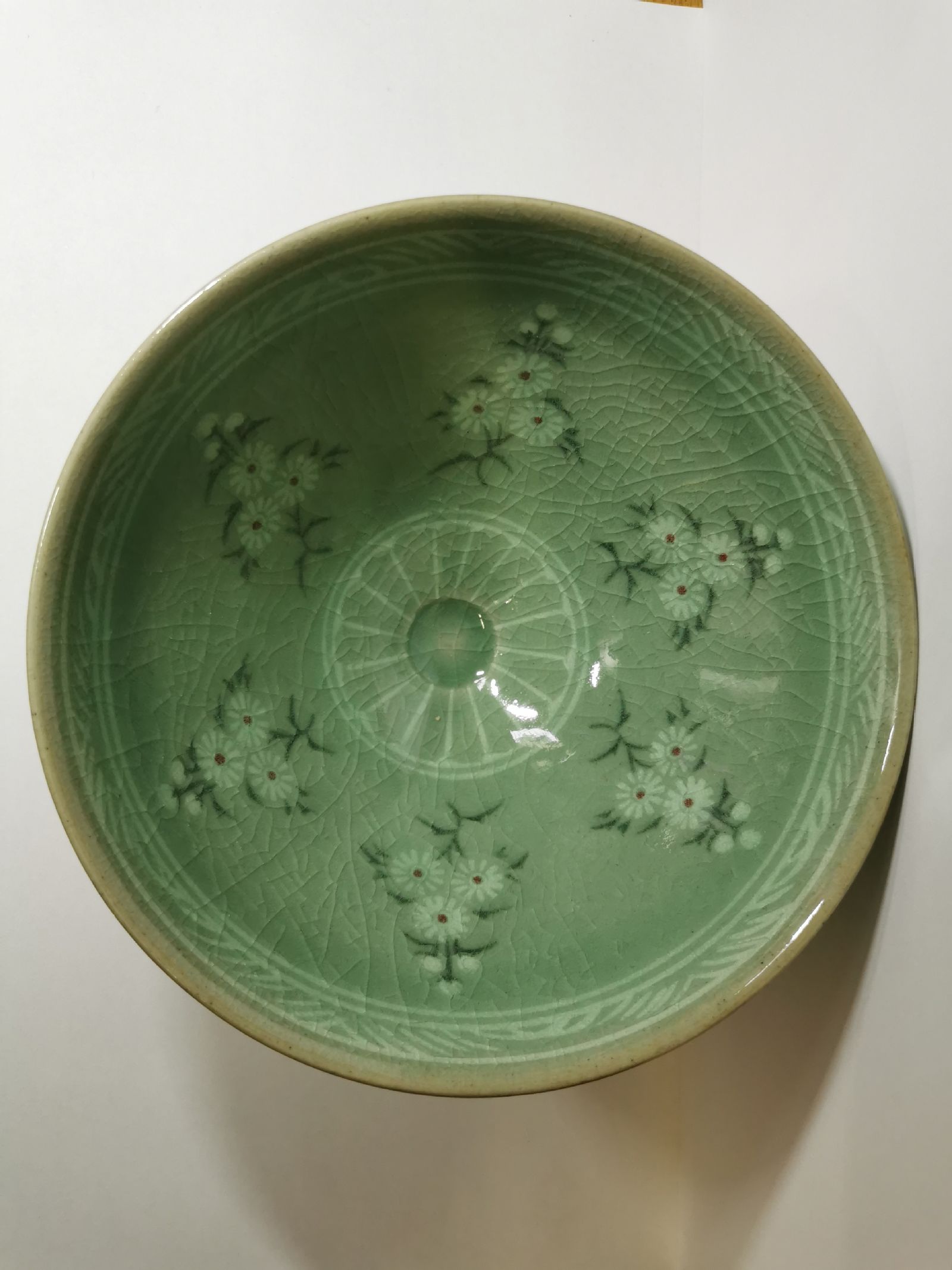 This classic Korean celadon teacup / bowl is very thin walled, 14cm wide and 7cm high.