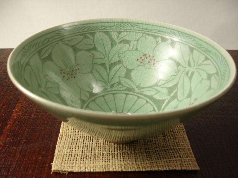 This classic Korean celadon teacup / bowl is very thin walled, 14cm wide and 7cm high.