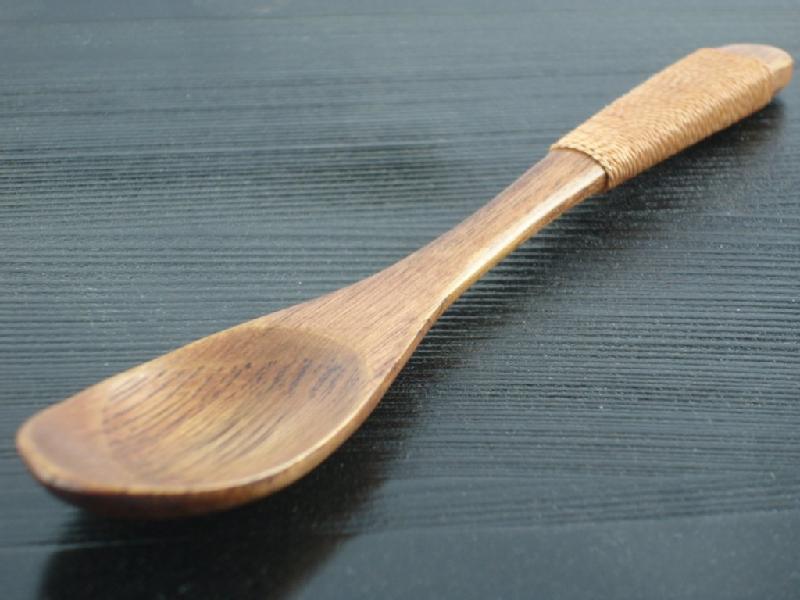 Magnificent Japanese measuring spoon; about 15 cm long and 2,7 cm wide; wound with thread .