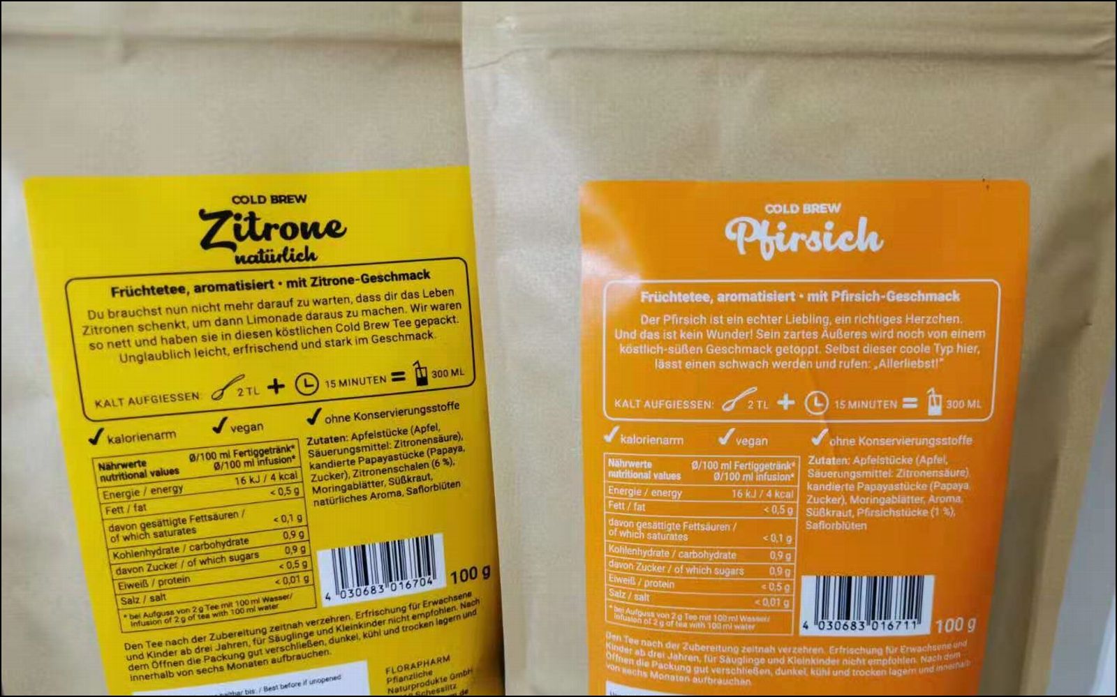Zutaten (Pfirsisch): Apfelstücke (Apfel, Säurungsmittel: Zitronensäure), kandierte Papayastücke (Papaya, Zucker), Moringablätter, Aroma, Süßkraut, Pfirsischstücke, Saflorblüten Zutaten (Zitrone): Apfelstücke (Apfel, Säurungsmittel: Zitronensäure), kandierte Papayastücke (Papaya, Zucker), Zitronenschalen, Moringablätter, Süßkraut, natürliches Aroma, Saflorblüten Zubereitung: 2 TL auf 300 ml kalten Wasser aufgießen und 15 Min ziehen lassen.