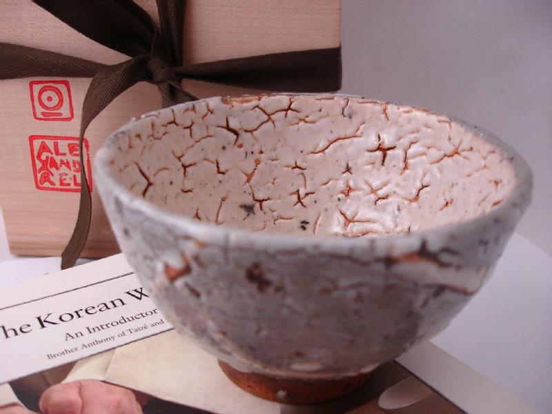 This unique teacup was crafted from 'raw', unscreened clay by the artist Alexandre Leroux. In accordance with traditional methods used in Korea, it was wood-fired (Anagama) for 76 oures at 1300°C and marked with the sign of the kiln it was fired in. A wild, rugged and very special artisanal piece that complements the beauty of nature magnificently. It is about 11cm wide and 6,5cm high. The bowl is covered with linen and a handmade, signet wooden box.