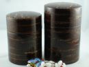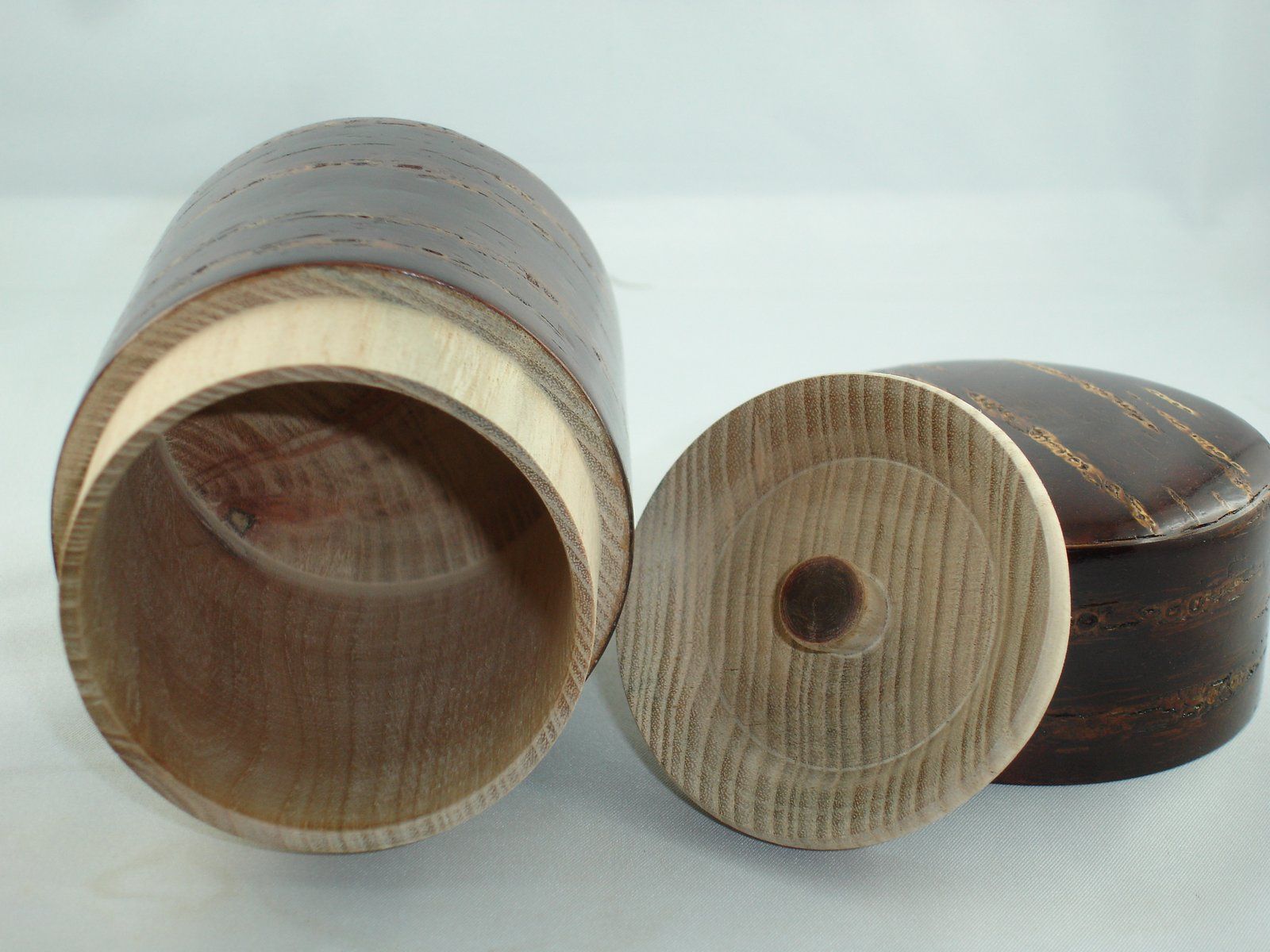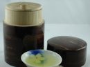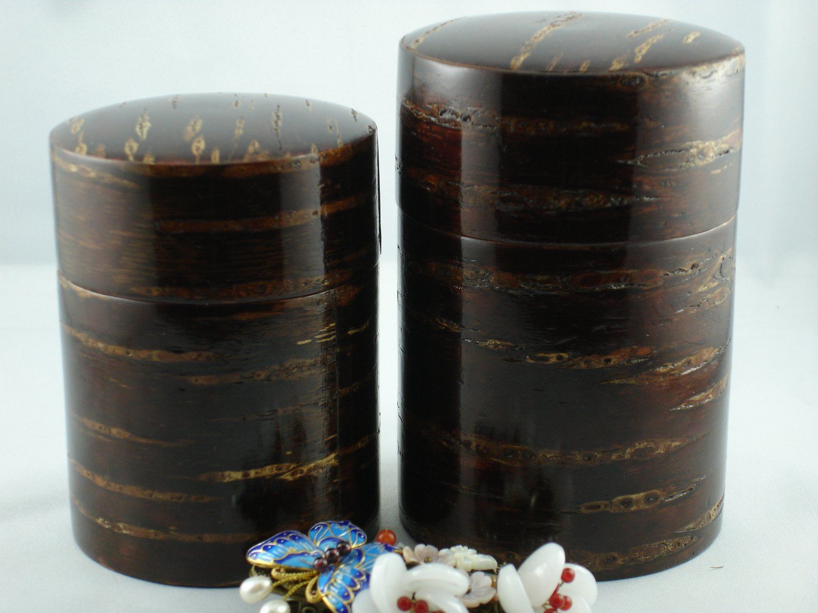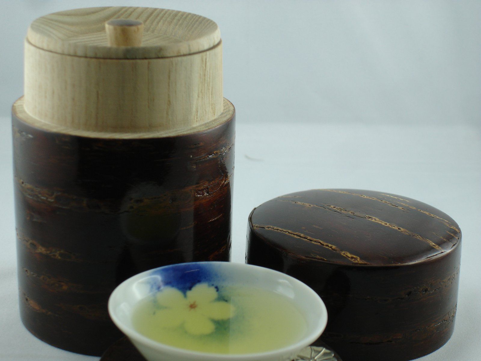Japanese tea caddy made from cherry bark for 100/150g of tea. 10,4 x 7,5/ 12,2 x 8 cm.The box has a wood interior.
