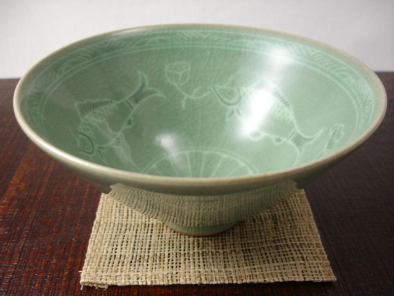This classic Korean celadon teacup / bowl is very thin walled, 14cm wide and 7cm high.