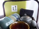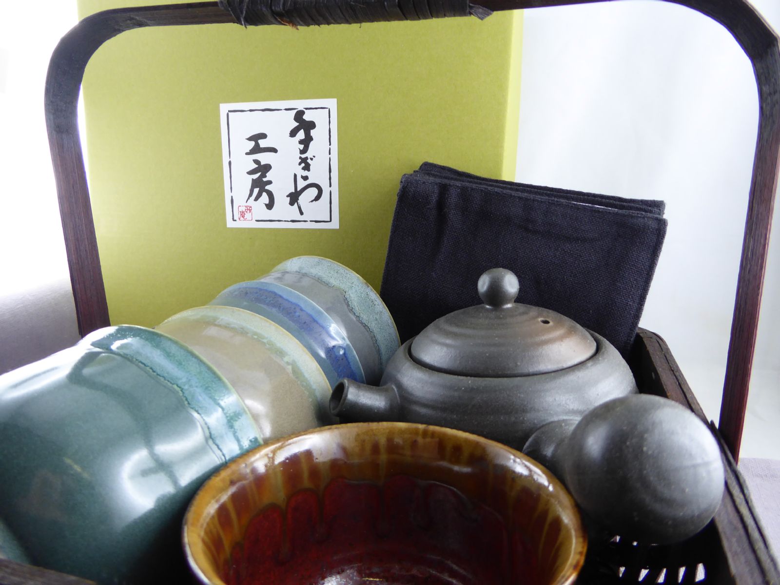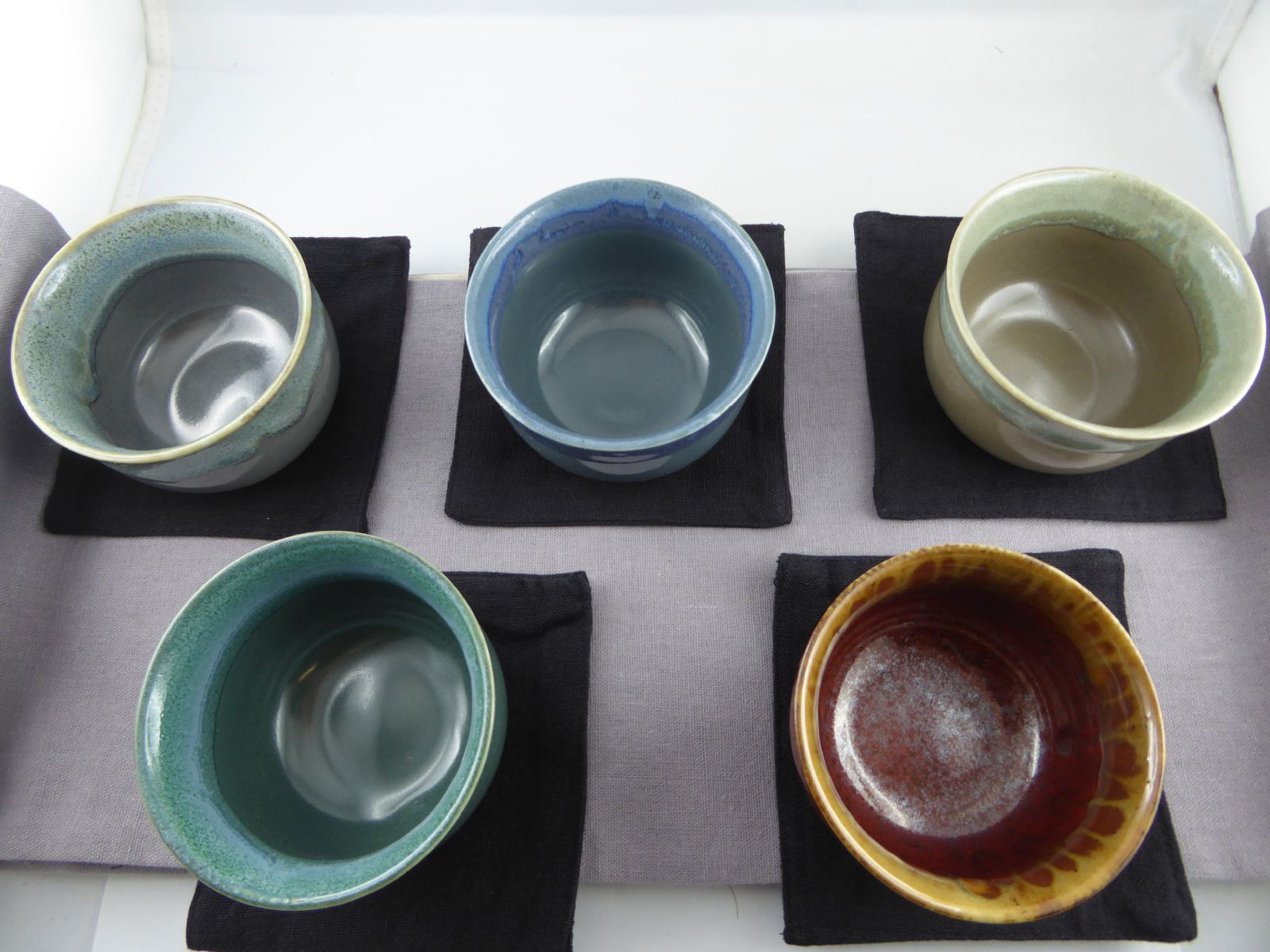 The tea service includes a jug, five cups and coasters made of fabric. Everything is stowed in a basket. The cups all have a different color, but are similar in style, so that the cups complement each other in colors and create a harmonious picture on the table. The coasters are all black. The jug has a metal strainer inside, which is removable. The cups are 5.8 cm high and have a diameter of 8.5 cm. The capacity of the jug is 230 ml. The set will be shipped in a box.