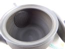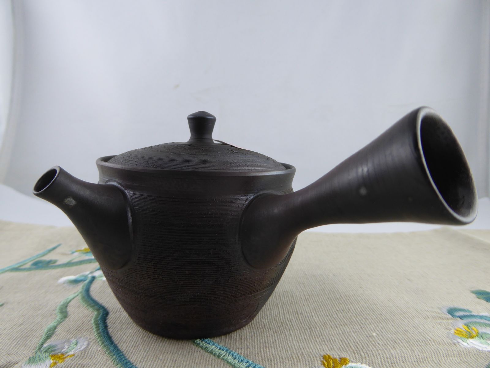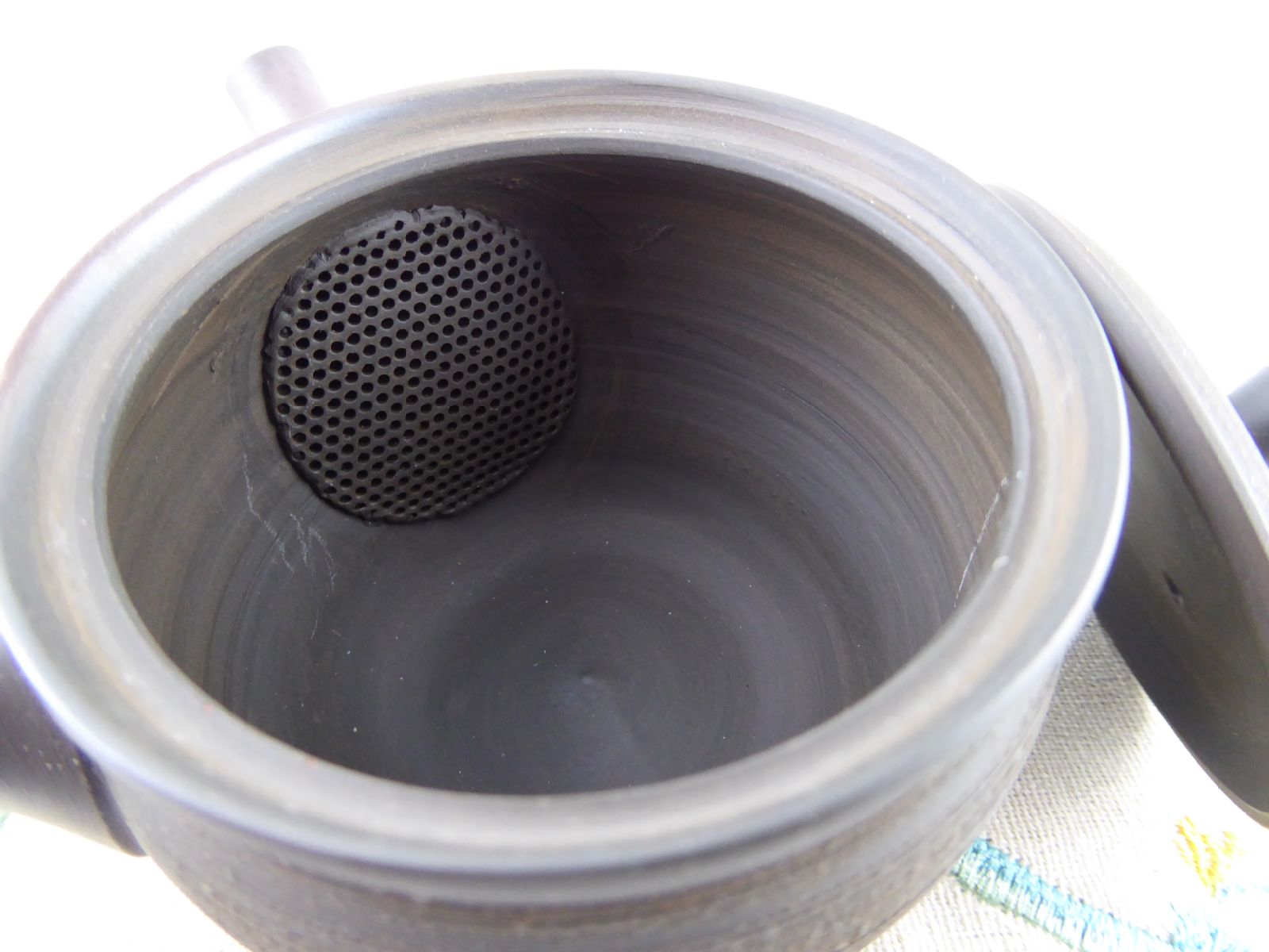 The jug is made of dark brown clay and has a ceramic strainer in front of the pouring spout.
